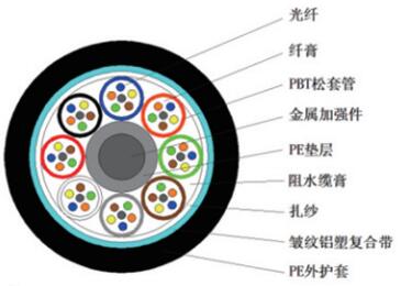 3.光缆结构紧凑,采用SZ层绞结构,确保光缆在恶劣的环境下,光纤不受到应力;铝带纵包缆芯使光缆挡潮效果更为优良;