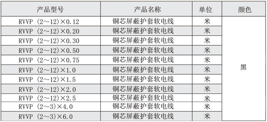 铜芯聚氯乙烯绝缘屏蔽聚氯乙烯护套软电缆,又叫做电气连接抗干扰软电缆,额定电压300/300V,线芯常用芯数为2- 24芯,常用线芯线径为:0. 12平方,0.2平方,0.3平方,0.4平方,0.5平方,1.0平方,1.5平方等。