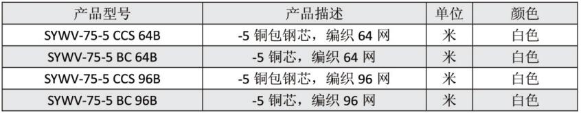 有线电视系统物理发泡聚乙烯绝缘同轴电缆SYWV-75-5(二屏蔽)型是采用高压氮气气注入发泡,绝缘层发泡均匀,各微孔间相互隔离,具有衰减低、性能稳定、使用寿命长、频带宽、防潮性能好,屏蔽性能优良等特点。主要适用于有线电视系统用干线、分支线和用户线。产品结构和性能符合国家入网要求。是新一代宽带多功能CATV网、接入网中传输电视、数据和语音信号的首先产品。